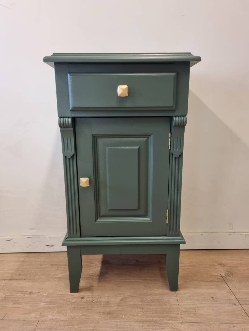 Een sfeervol nachtkastje met genoeg opbergruimte en een mooie kleur. Waar vind je die nog? Dit nachtkastje had wat liefde nodig, maar met een mooie groene kleur, een nieuw onderstel en nieuwe knopjes is hij perfect voor elke slaapkamer.