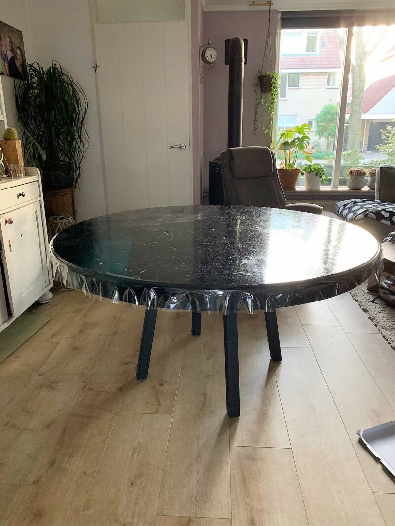 Op deze eettafel zat niet alleen zwarte verf. Tijdens het schuren kwamen ook de kleuren grijs, turkoois en wit tevoorschijn! De houten rand aan de onderkant heb ik verwijderd zodat de tafel een stuk strakker werd. Na het volledig kaal schuren van het tafelblad is het blad goed behandeld met houtolie.