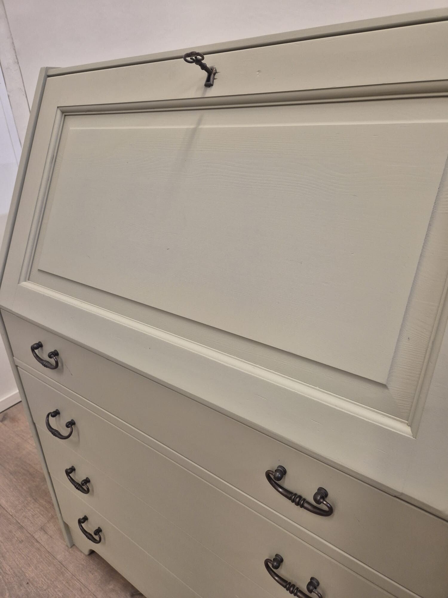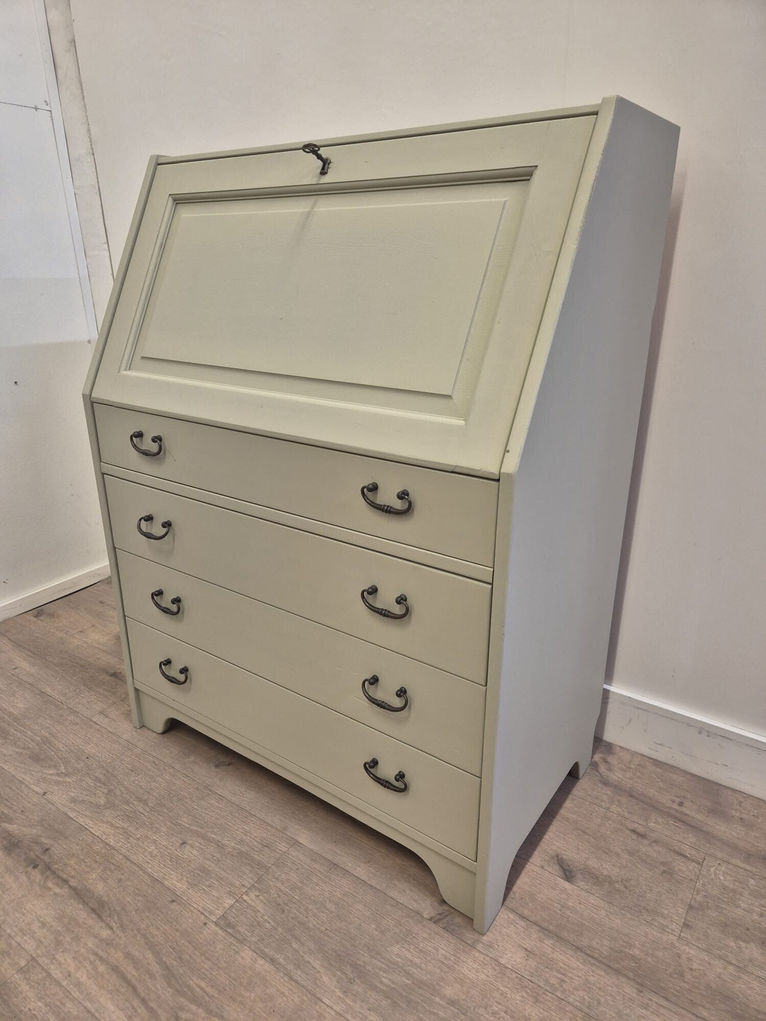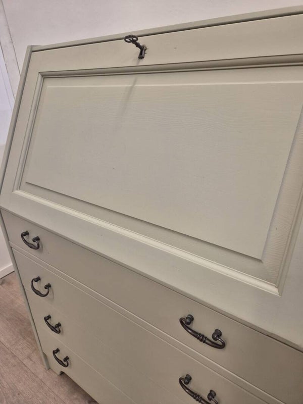Leuke secretaire voor in de woonkamer of op een slaapkamer. Gespoten in de kleur 'Beschermend'.Hoog 108cm, breed 83cm, diep 46cm.
