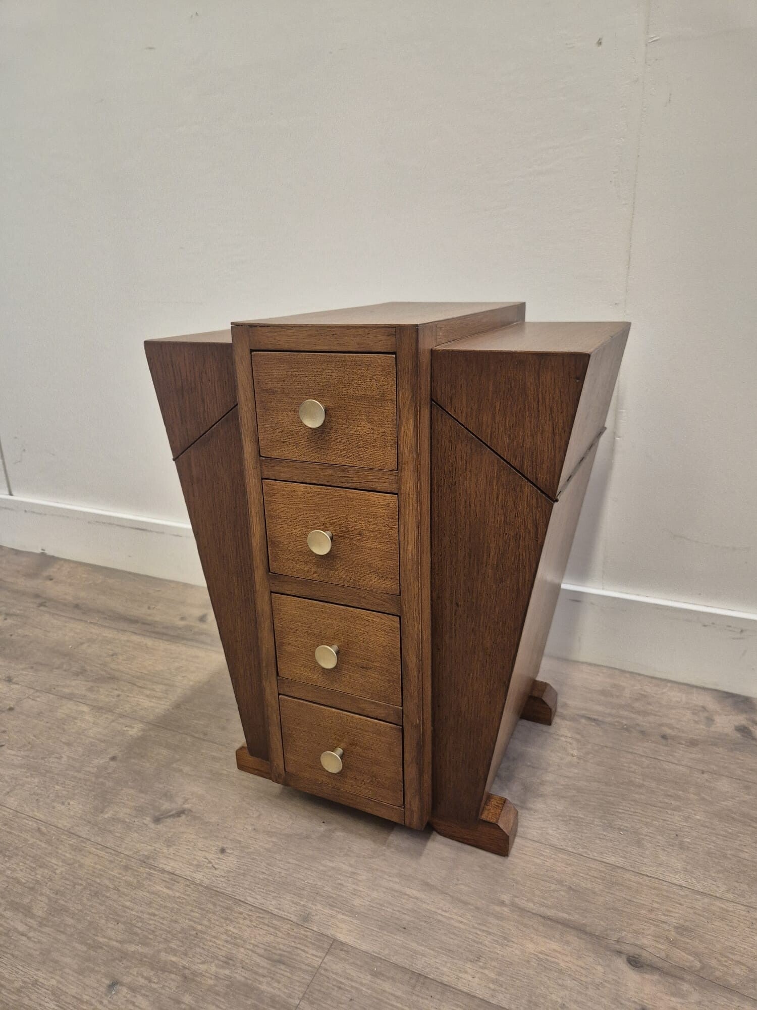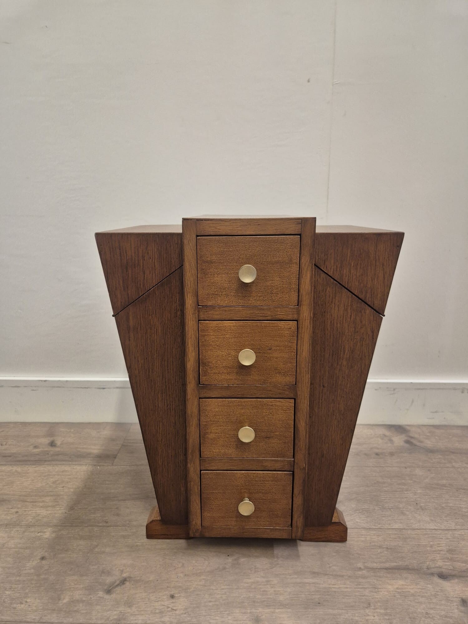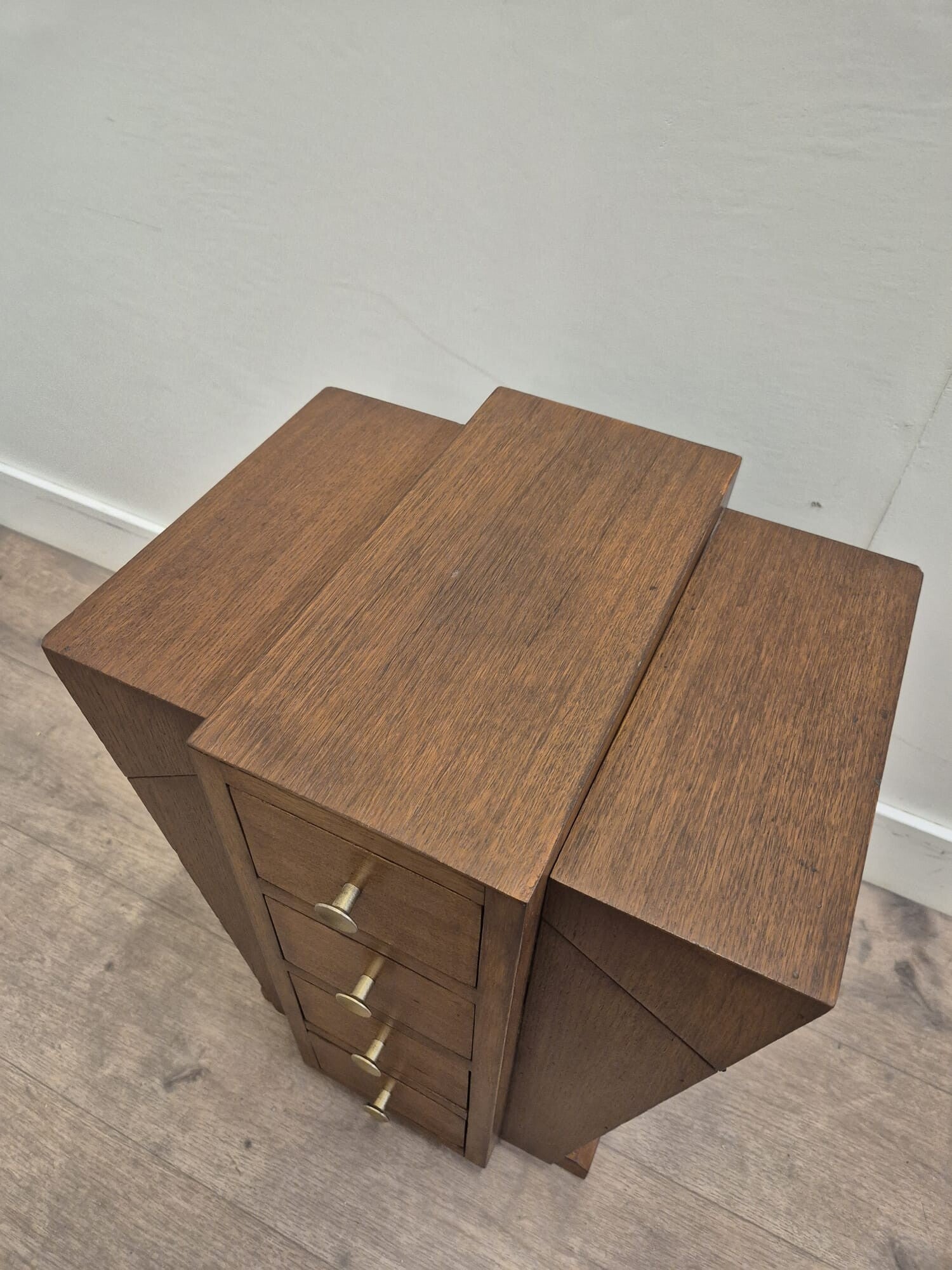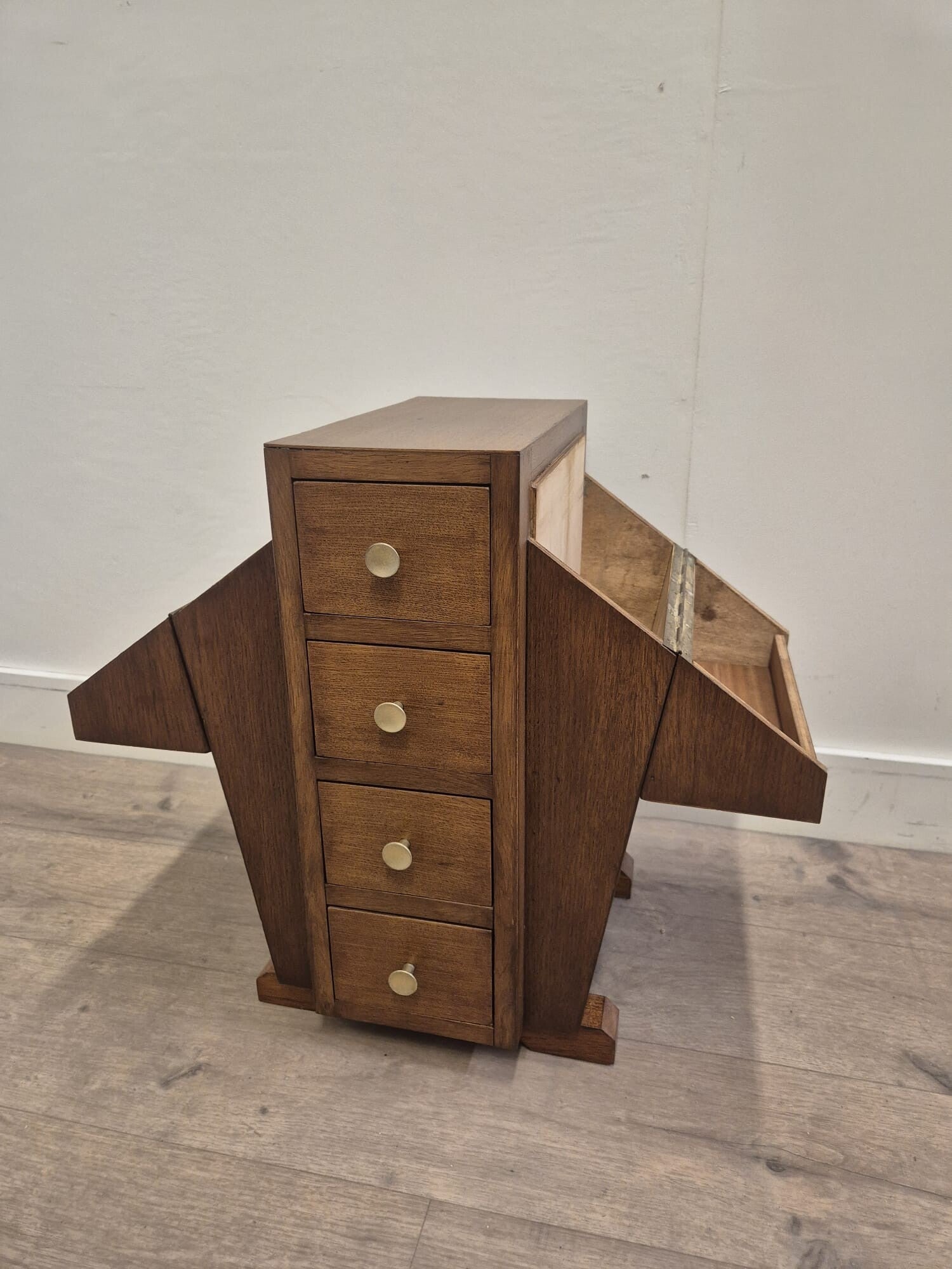 Een uniek, handgemaakt meubel wat goed te gebruiken is als nachtkastje of bijzetkastje. Oorspronkelijk is hij gemaakt als naaikastje.
